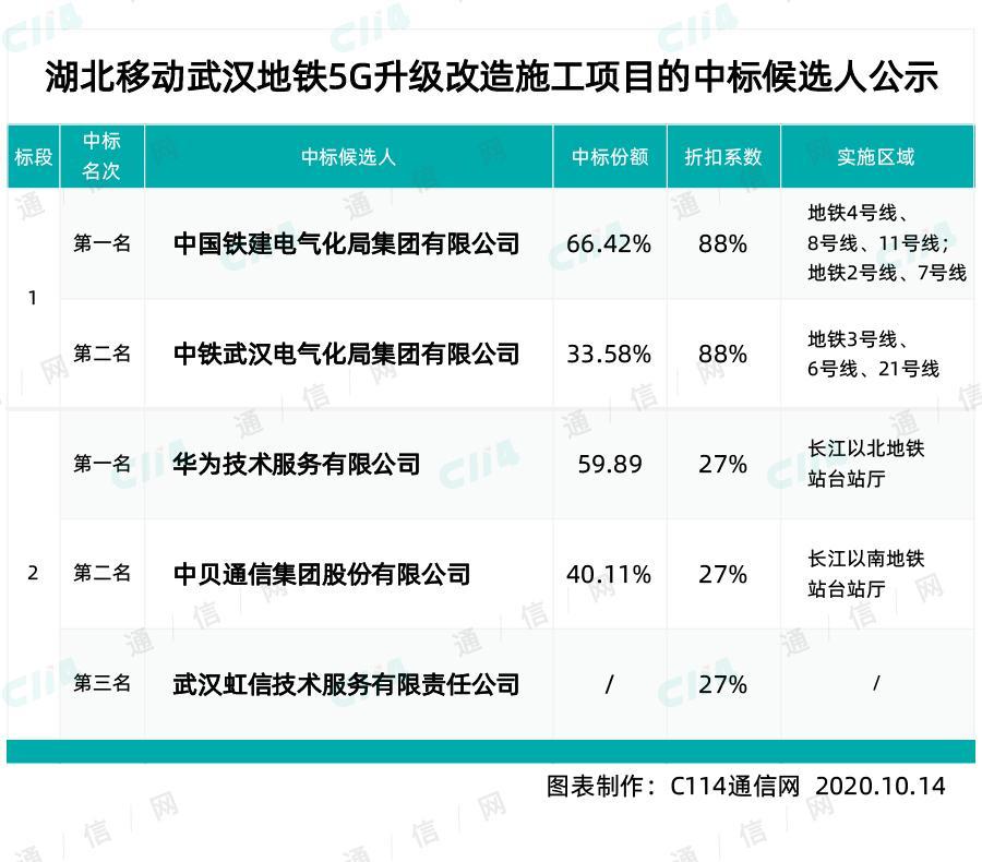 昨日,湖北移动武汉地铁5G升级改造施工项目的中标候选人公示,华为、中铁等4企业中标。